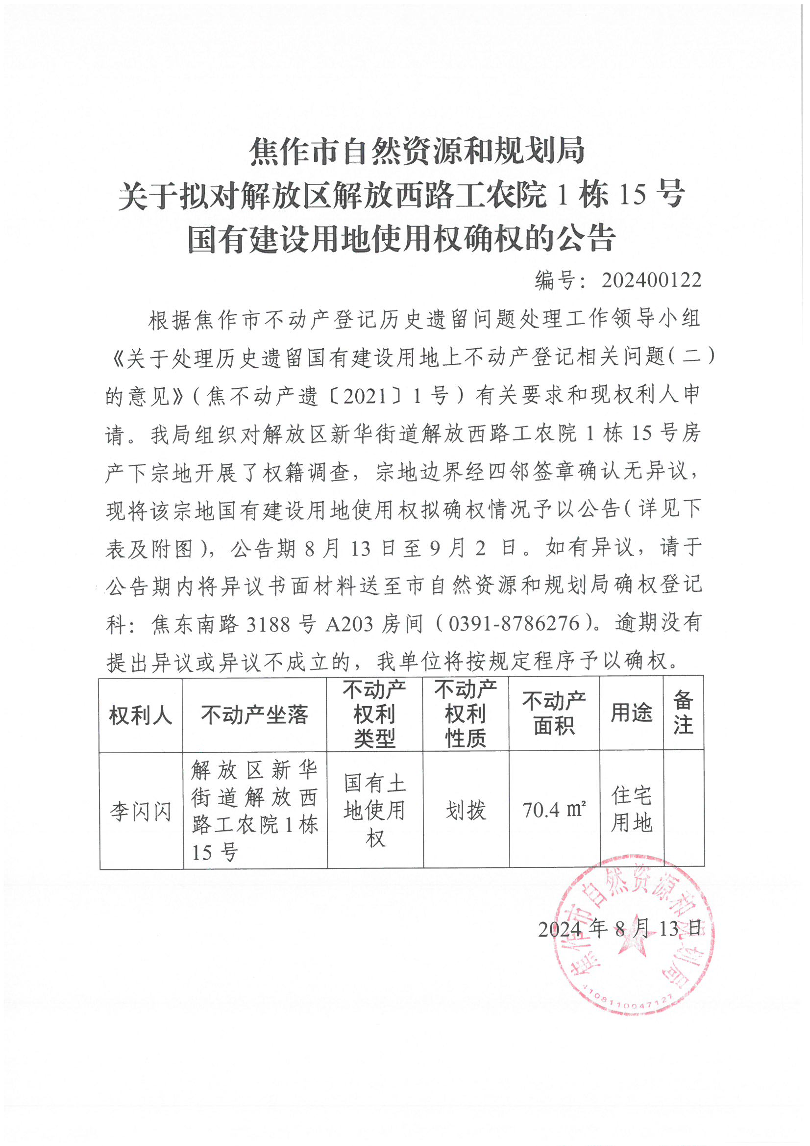 关于拟对解放区新华街道解放西路工农院1栋15号国有建设用地使用权确权登记的公告-澳门英皇娱乐app下载