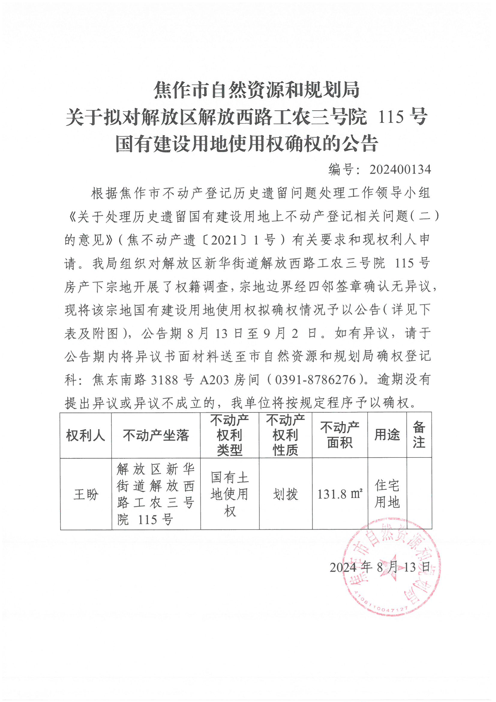 关于拟对解放区新华街道解放西路工农三号院 115号国有建设用地使用权确权登记的公告