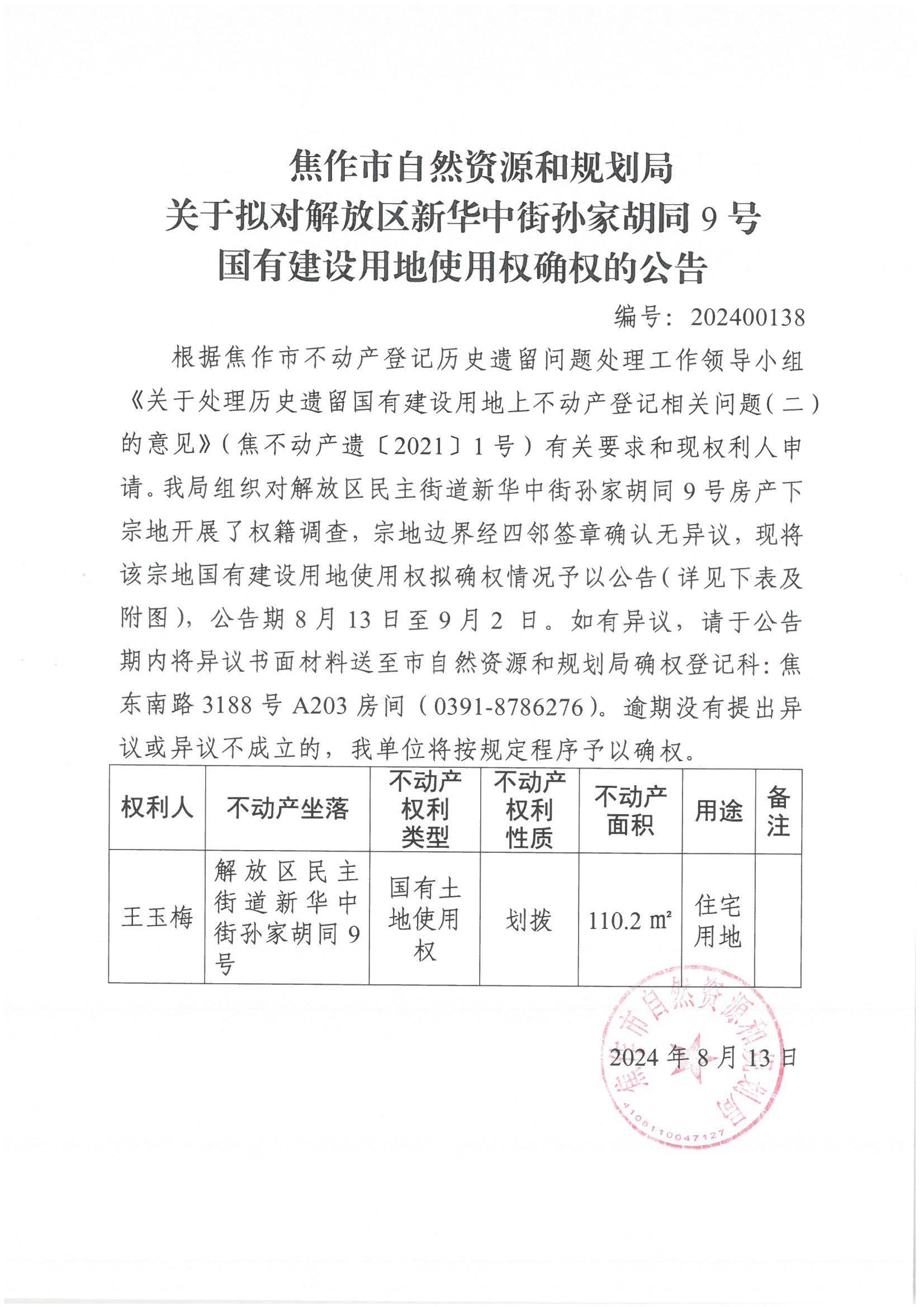关于拟对解放区民主街道新华中街孙家胡同9号国有建设用地使用权确权登记的公告