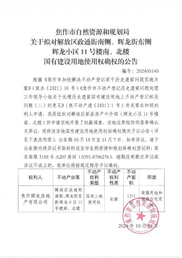 关于拟对解放区政通街南侧、辉龙街东侧辉龙小区11号楼南、北楼国有建设用地使用权确权的公告-澳门英皇娱乐app下载
