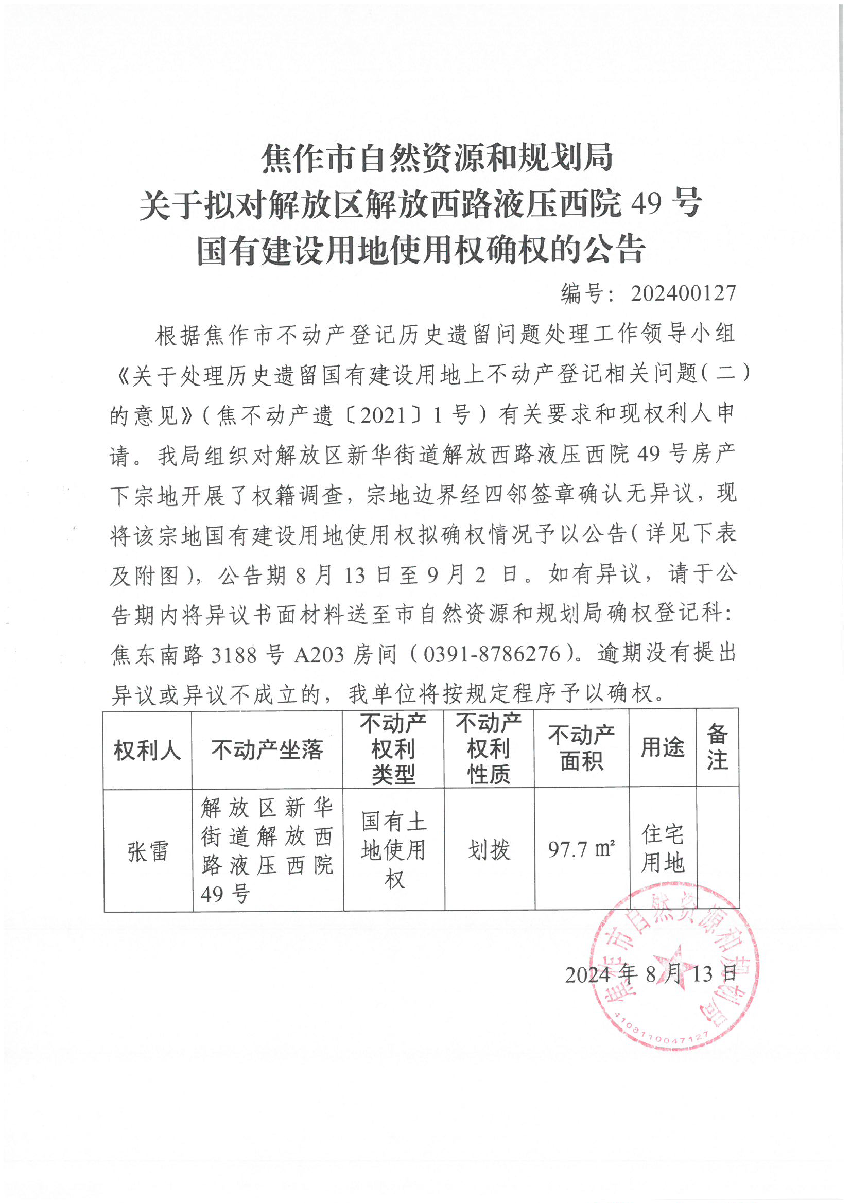 关于拟对解放区新华街道解放西路液压西院49号国有建设用地使用权确权登记的公告-澳门英皇娱乐app下载
