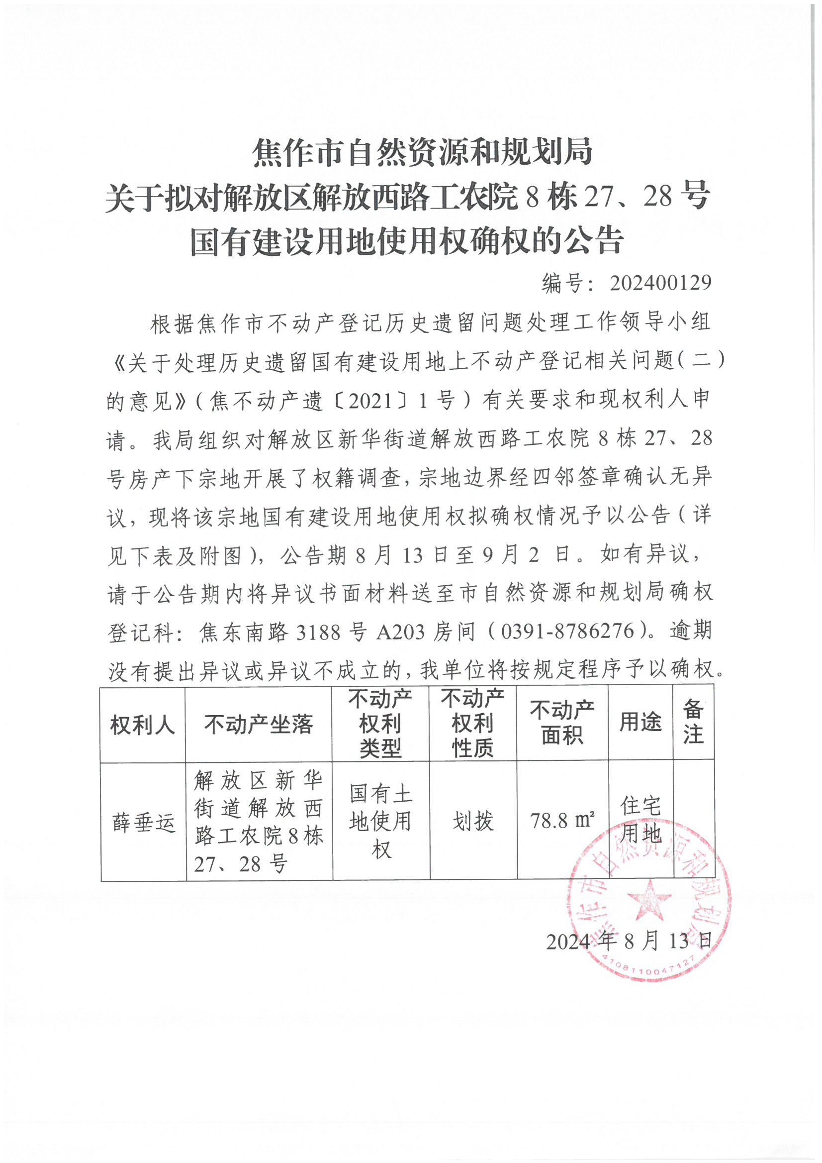 关于拟对解放区新华街道解放西路工农院8栋27、28号国有建设用地使用权确权登记的公告-澳门英皇娱乐app下载