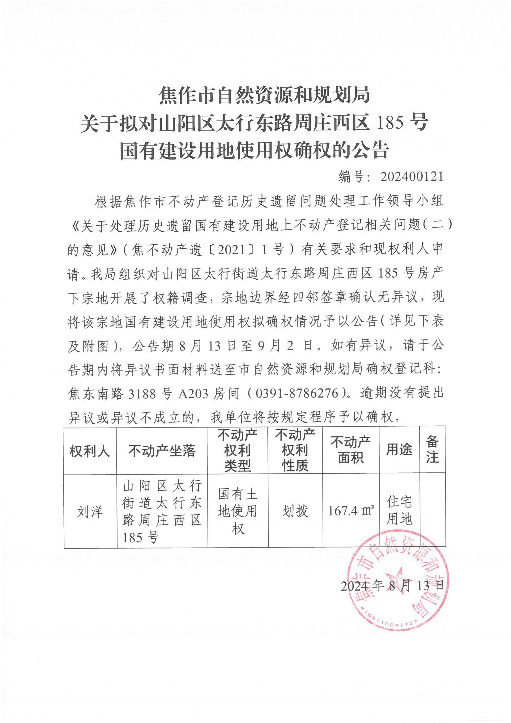 关于拟对山阳区太行街道太行东路周庄西区185号国有建设用地使用权确权登记的公告-澳门英皇娱乐app下载