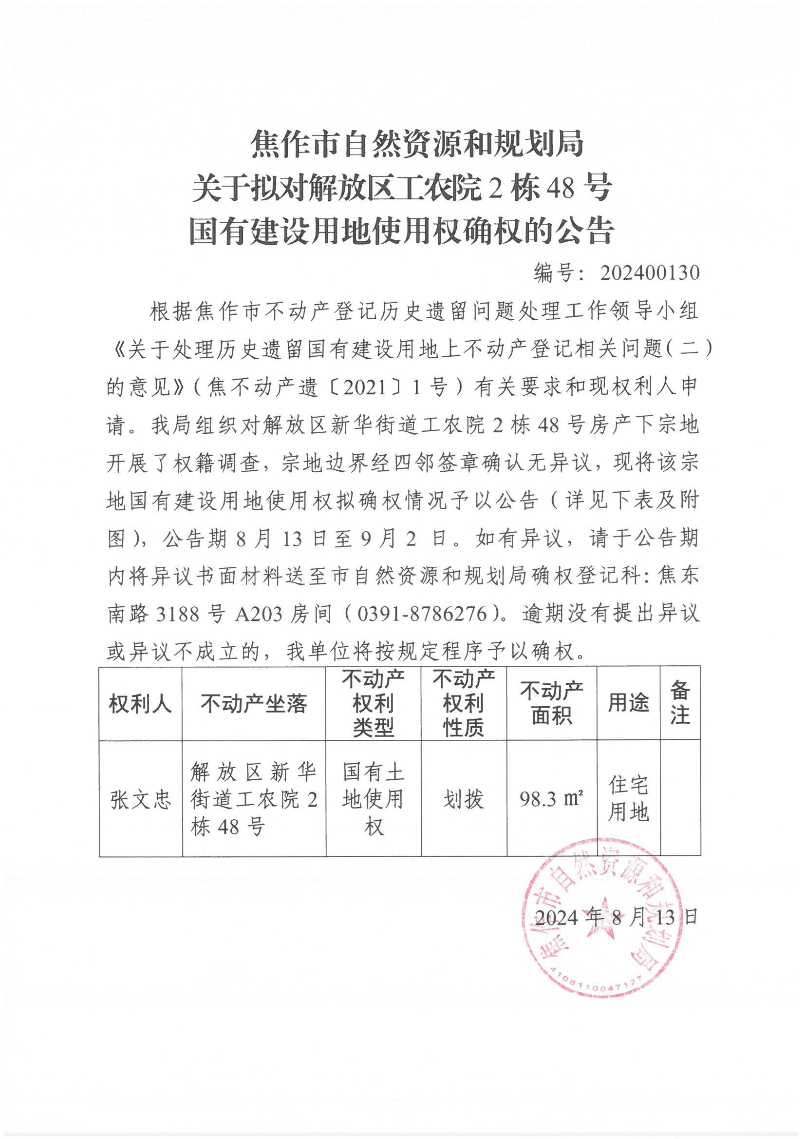 关于拟对解放区新华街道工农院2栋48号国有建设用地使用权确权登记的公告-澳门英皇娱乐app下载