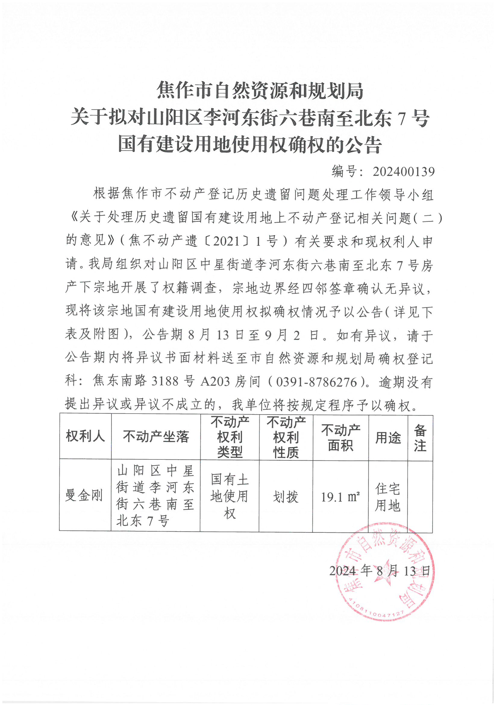 关于拟对山阳区中星街道李河东街六巷南至北东7号国有建设用地使用权确权登记的公告-澳门英皇娱乐app下载