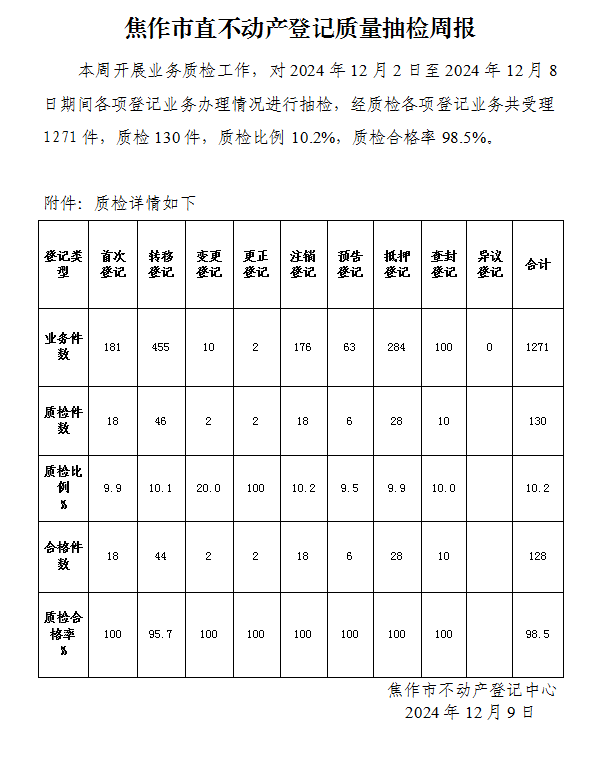 焦作市直不动产登记质量抽检周报(2024年12月2日-澳门英皇娱乐app下载