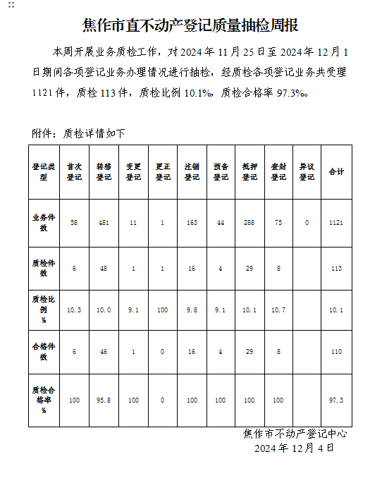 焦作市直不动产登记质量抽检周报(2024年11月25日-12月1日)