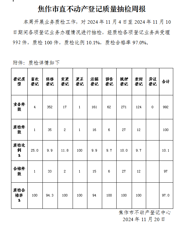 焦作市直不动产登记质量抽检周报(2024年11月4日-11月10日)